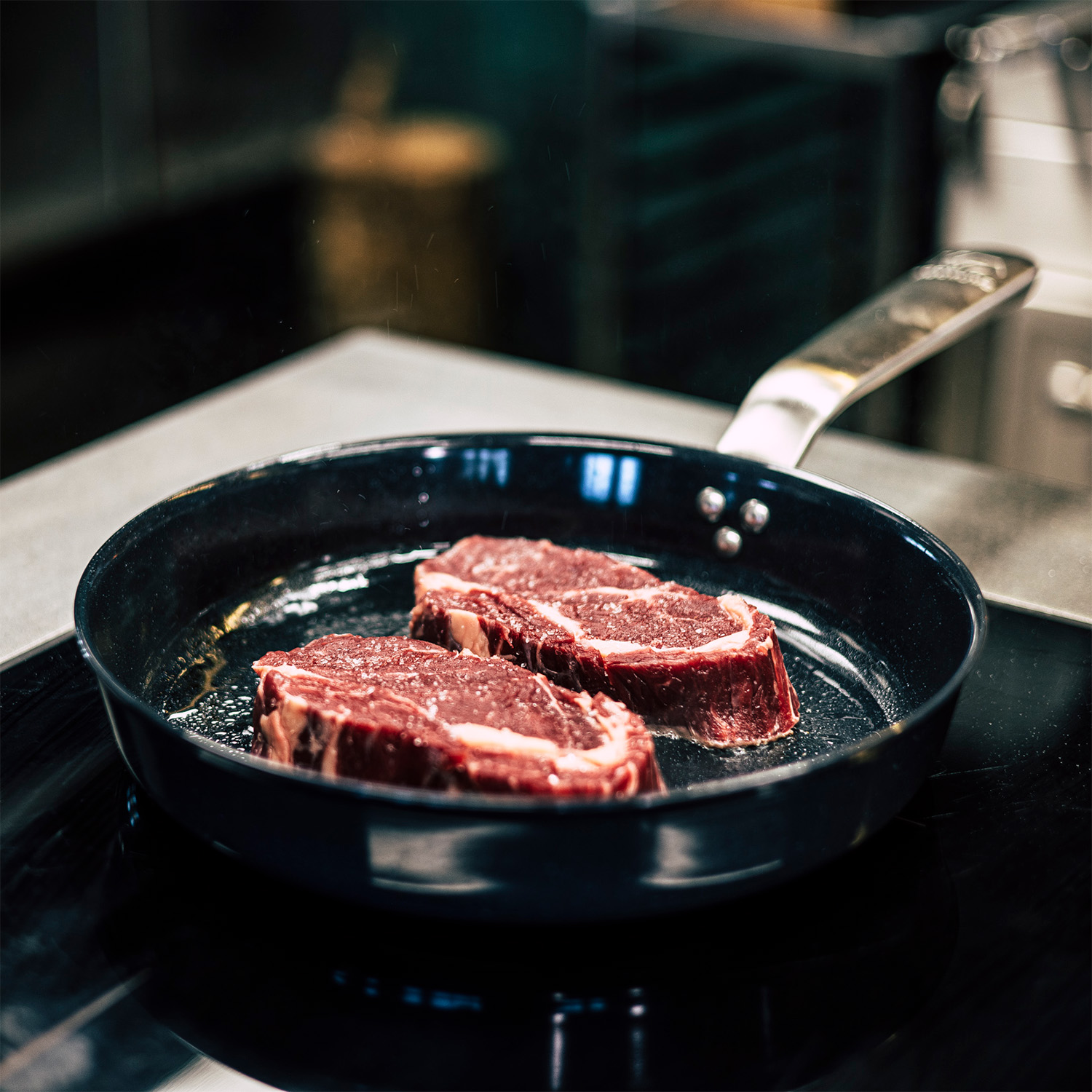 Värm upp pannan långsamt, ungefär fem minuter på svag värme innan du höjer till medelvärme. Eftersom pannan är tillverkad av kolstål vill vi att värmen sprids långsamt och jämnt, så behåller den formen och ger bästa resultat.